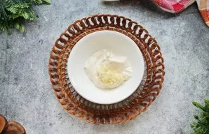 7. Paruoškite padažą. Susmulkinkite česnaką ir sumaišykite su majonezu. -