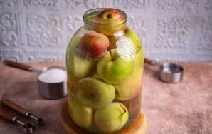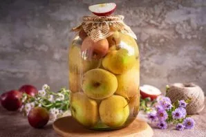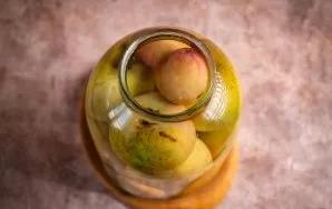 8. Uždenkite stiklainį dangteliu ir padėkite jį ant didelio puodo, iškloto virtuviniu rankšluosčiu, dugno. Pripilkite vandens ir užvirinkite ant vidutinės ugnies. Sterilizuokite stiklainį su marinuotais obuoliais 25–30 minučių.