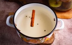 6. Supilkite šį vandenį į puodą, suberkite cukrų, pipirus, gvazdikėlius ir cinamoną. Užvirinkite. Tada įpilkite acto. Marinatas paruoštas.