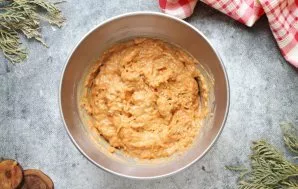 8. Miltų mišinį persijokite į dubenį su kiaušiniais ir morkomis, švelniai išmaišykite iki vientisos masės. Turėtų būti kaip tiršta grietinė. -