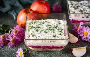 Sluoksniuotos salotos su marinuotais grybais