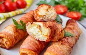 Paprastas ir gardus užkandis, pagamintas iš šonine apvyniotos duonos. Tai gali būti greiti pusryčiai arba tiesiog sotus užkandis. Nuostabu jau nuo pirmo kąsnio! Būtinai išbandykite! Šiam patiekalui rinkitės kvadratinį batoną. Galite naudoti bet kokį sūrį, kuris jums patinka. Patogu naudoti lydyto sūrio griežinėlius. Bet galite naudoti ir bet kokį kitą ir tiesiog supjaustyti jį gabalėliais.