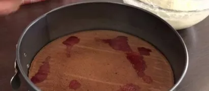 4. Atvėsinkite biskvitą kepimo formoje, išimkite jį iš kepimo popieriaus, kepimo formą išklokite nauju kepimo popieriumi ir įdėkite biskvitą viršumi žemyn. Apšlakstykite biskvitą vyšnių kompotu. Ant biskvito uždėkite varškės ir išlyginkite. -